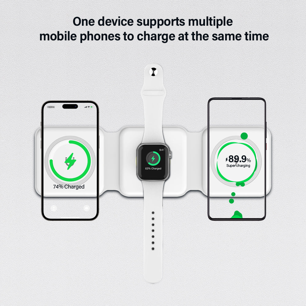 - 3-in-1 Functionality: Charge your phone, smartwatch, and earbuds simultaneously.